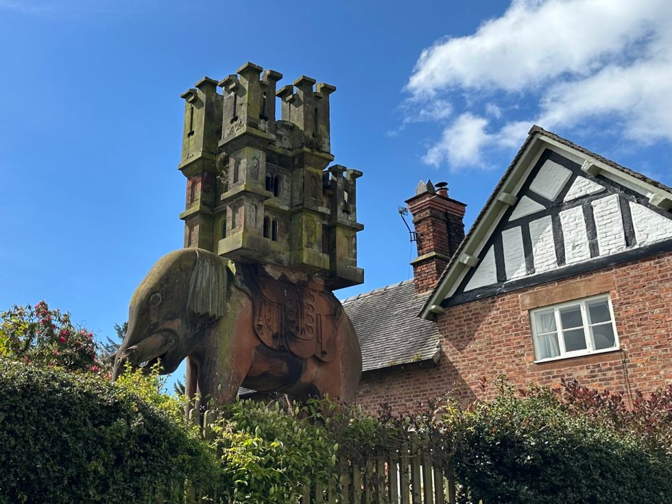 Exploring the rather charming little village of Peckforton in Cheshire, one might stumble across a rather unusual garden ornament. Tucked into a hedge, bordering a garden, is a huge stone elephant carrying a castle on its back. This was carved by the local stonemason, John Watson, and all sorts of stories are told of its history.