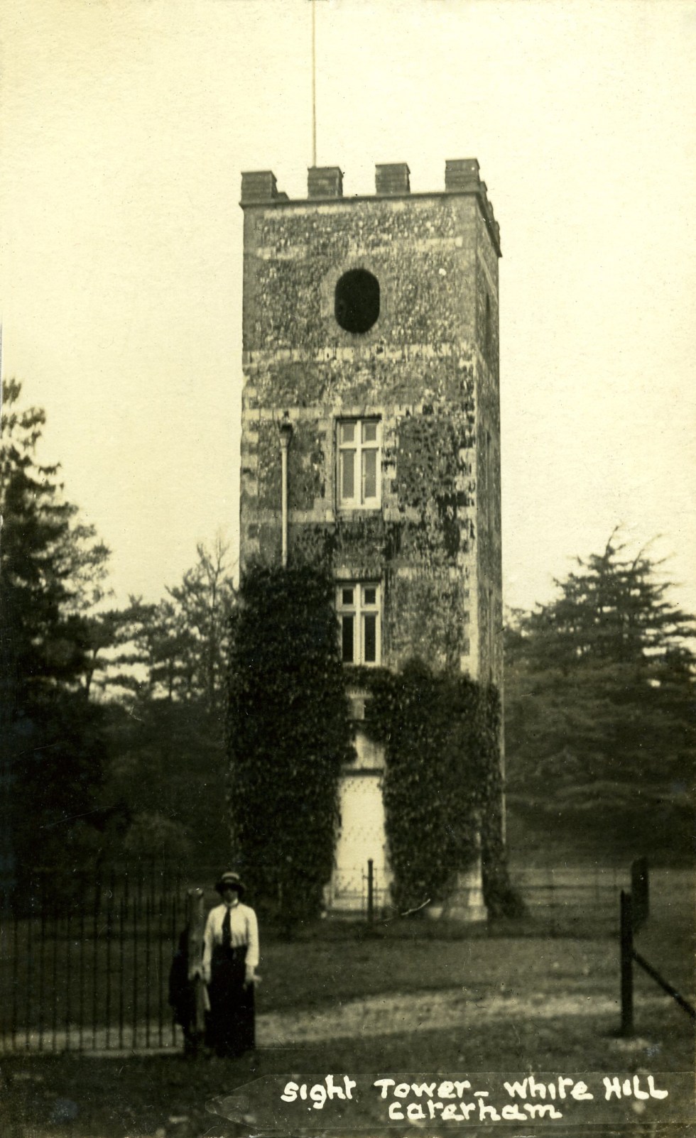 Since the late 19th century Caterham Barracks had been a depot for the foot guards regiments, and during the First World War the tower was used as one of their guard rooms. In March 1915 one of the soldiers wrote a brief account of life there on the postcard above. He recalled how ’22 of us used to “hang out” & cook for ourselves in this old watch tower […] each room was only 10 feet square, so you may guess that with equipment & rifles we were some squash’.